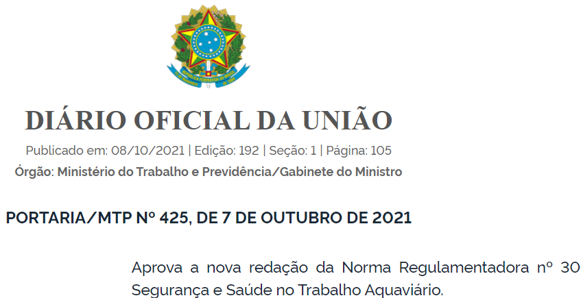 Veja a Portaria na íntegra através do link: PORTARIA_MTP Nº 425, DE 7 DE OUTUBRO DE 2021 – PORTARIA_MTP Nº 425, DE 7 DE OUTUBRO DE 2021 – DOU – Imprensa Nacional